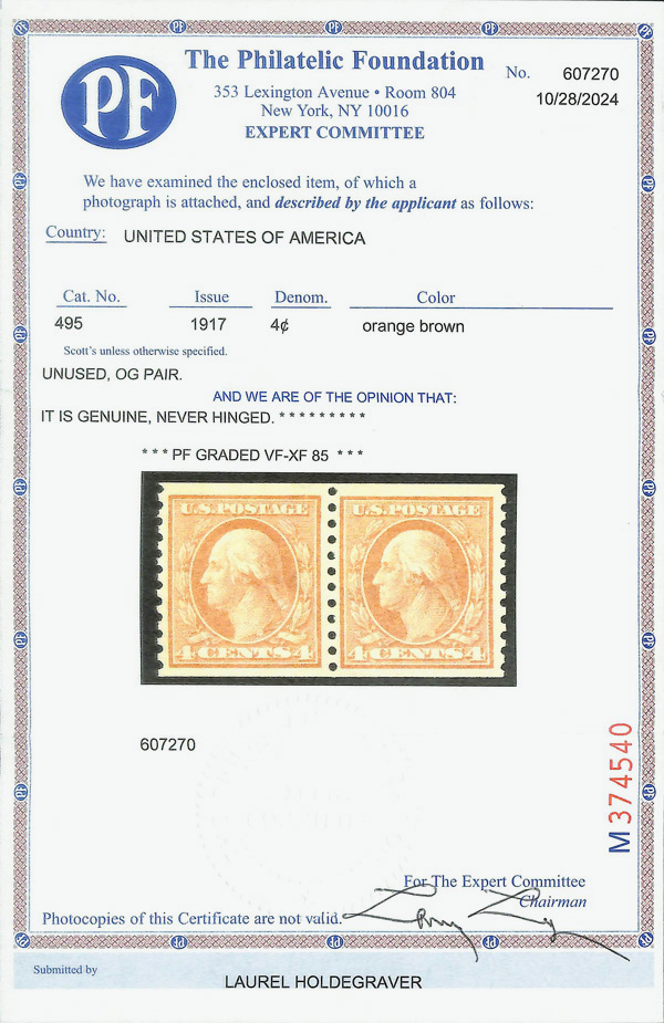 8236 nh 495 image1917, 4¢ orange brown, unwatermarked, rotary press coil, perf. 10 vertically (Scott 495), pair, o.g., never hinged, Very Fine to Extremely Fine, with 2024 P.F. certificate graded VF-XF 85.