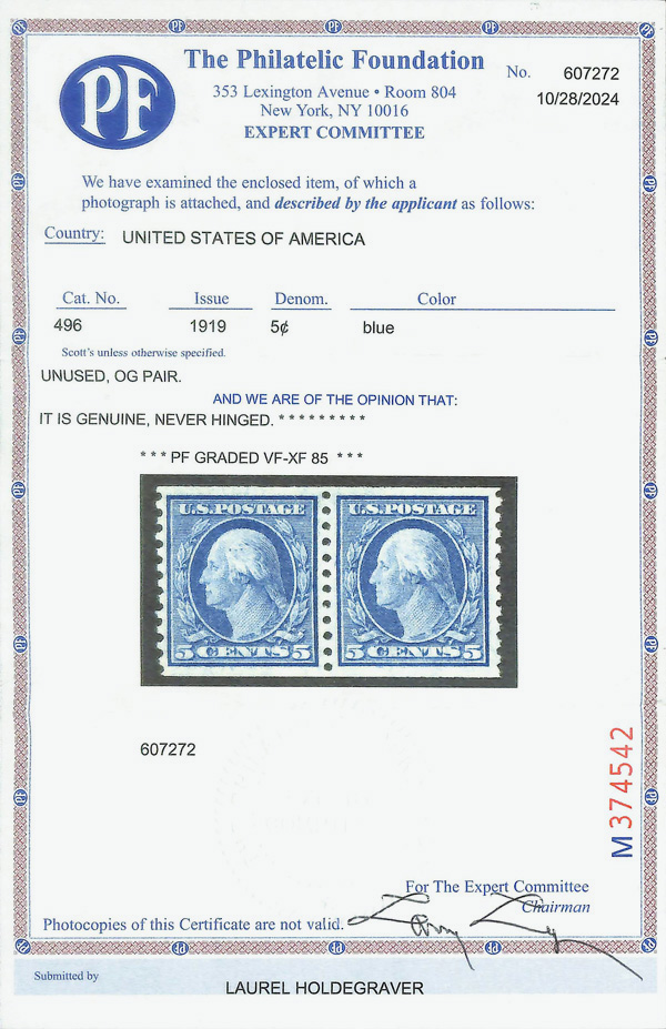 8238 nh 496 image1919, 5¢ blue, unwatermarked, rotary press coil, perf. 10 vertically (Scott 496), pair, o.g., never hinged, Very Fine to Extremely Fine, with 2024 P.F. certificate graded VF-XF 85.