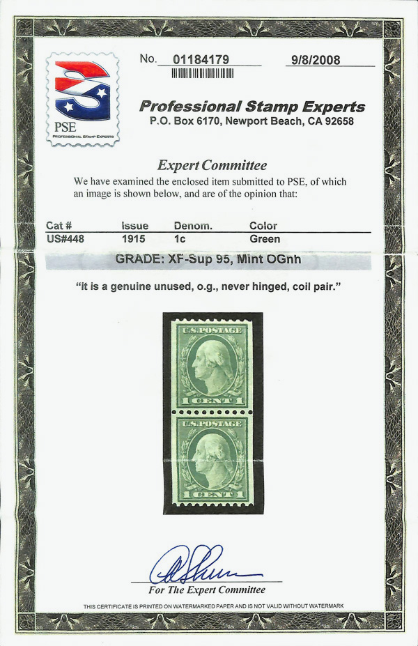 8206 nh 448 image1915, 1¢ green, S.L. watermark, rotary press coil, perf. 10 horizontally (Scott 448), pair, o.g., never hinged, Extremely Fine to Superb, with 2008 P.S.E. certificate graded XF-SUP 95.