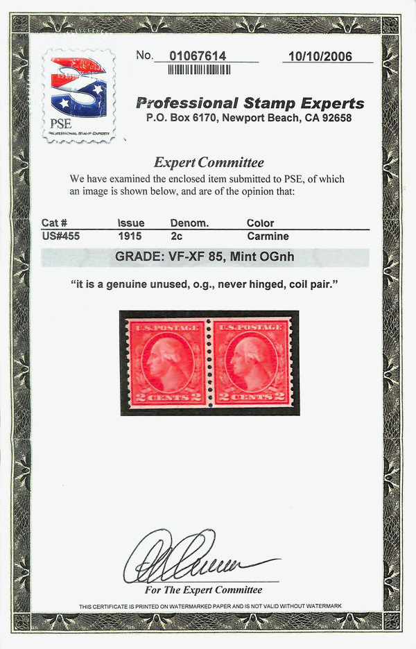 8213 nh 455 image1915, 2¢ carmine, type III, S.L. watermark, rotary press coil, perf. 10 vertically (Scott 455), pair, o.g., never hinged, Very Fine to Extremely Fine, with 2006 P.S.E. certificate graded VF-XF 85.