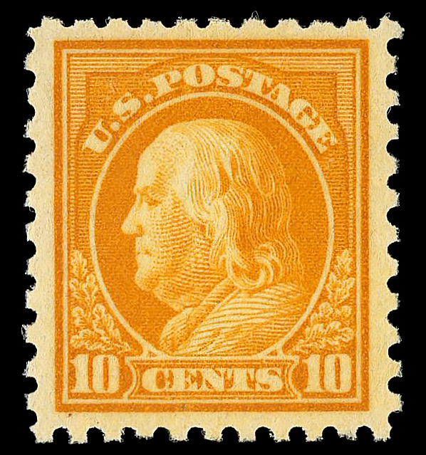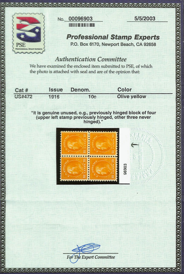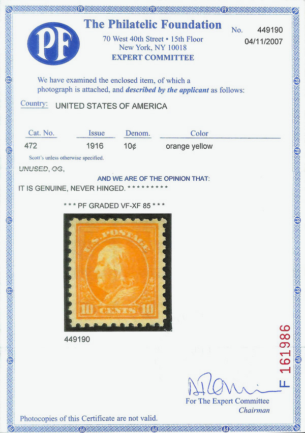 8217 nh 472 image1916, 10¢ orange yellow, unwatermarked, perf. 10 (Scott 472), o.g., never hinged, Very Fine to Extremely Fine, with 2007 P.F. certificate graded VF-XF 85 & 2003 P.S.E. certificate.