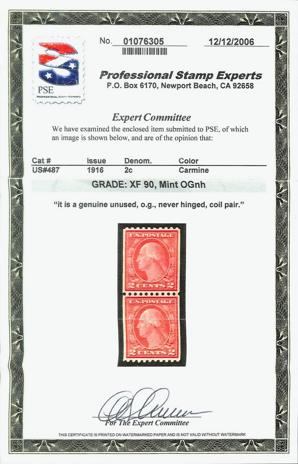 8226 nh 487 image1916, 2¢ carmine, type II, unwatermarked, rotary press coil, perf. 10 horizontally (Scott 487), pair, o.g., never hinged, Extremely Fine, with 2006 P.S.E. certificate graded XF 90.