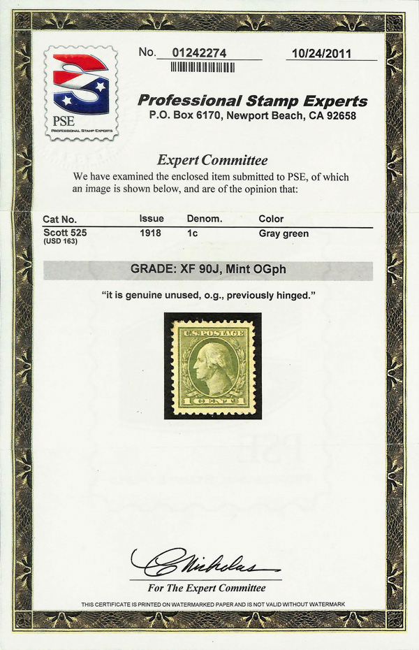 8275 og 525 image1918, 1¢ gray green, offset printing (Scott 525), o.g., very lightly hinged, fresh and bright stamp with clean color and jumbo margins of pure white; vertical gum crease noted for accuracy, Extremely Fine, with 2011 P.S.E. certificate graded XF 90 J.