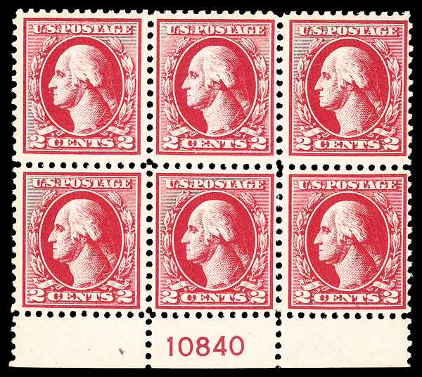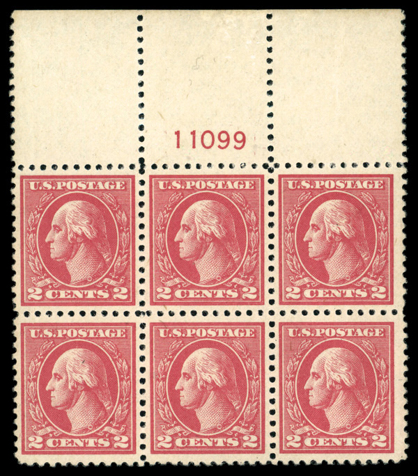 8277 nhbl 527 image1918, 2¢ carmine, type V, offset printing (Scott 527), plate block of 6, o.g., never hinged, Very Fine.