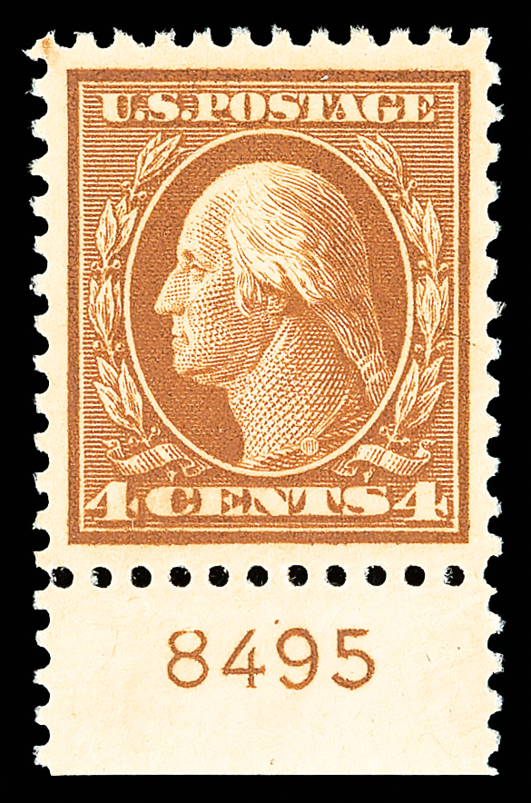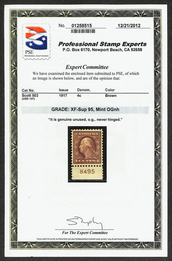 8252 nh 503 image1917, 4¢ brown, perf. 11 (Scott 503), single with plate number, nearly perfectly centered, lush deep hue, o.g., never hinged, Extremely Fine to Superb, with 2012 P.S.E. certificate graded XF-SUP 95.