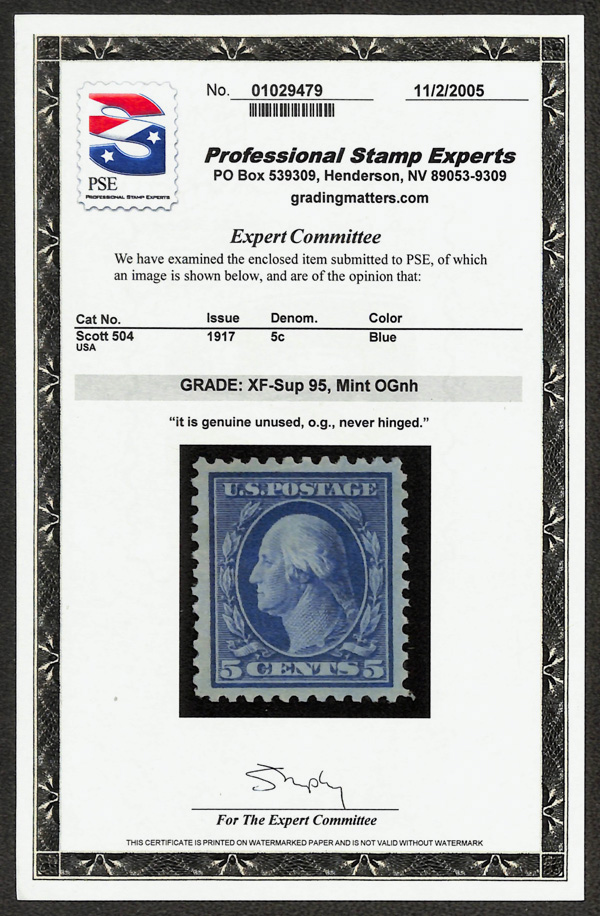 8254 nh 504 image1917, 5¢ blue, perf. 11 (Scott 504), bold, distinct impression, o.g., never hinged, Extremely Fine to Superb, with 2005 P.S.E. certificate graded XF-SUP 95.