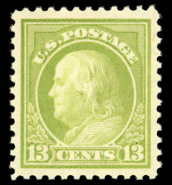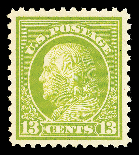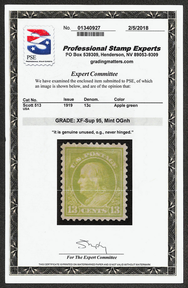 8266 nh 513 image1919, 13¢ apple green, perf. 11 (Scott 513), exceptional freshness and brilliance, o.g., never hinged, Extremely Fine to Superb, with 2018 P.S.E. certificate graded XF-SUP 95.