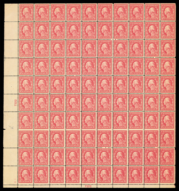 8247 nh/ogbl 499 image1917, 2¢ rose, type I, perf. 11 (Scott 499), bottom left full pane of 100 with plate number 7322, sound and Post Office fresh, with interesting shifted row of blind perforations between rows 7 & 8; positions 10 & 100 hinged, all others never hinged, Very Fine, with 2024 P.S.E. certificate.
