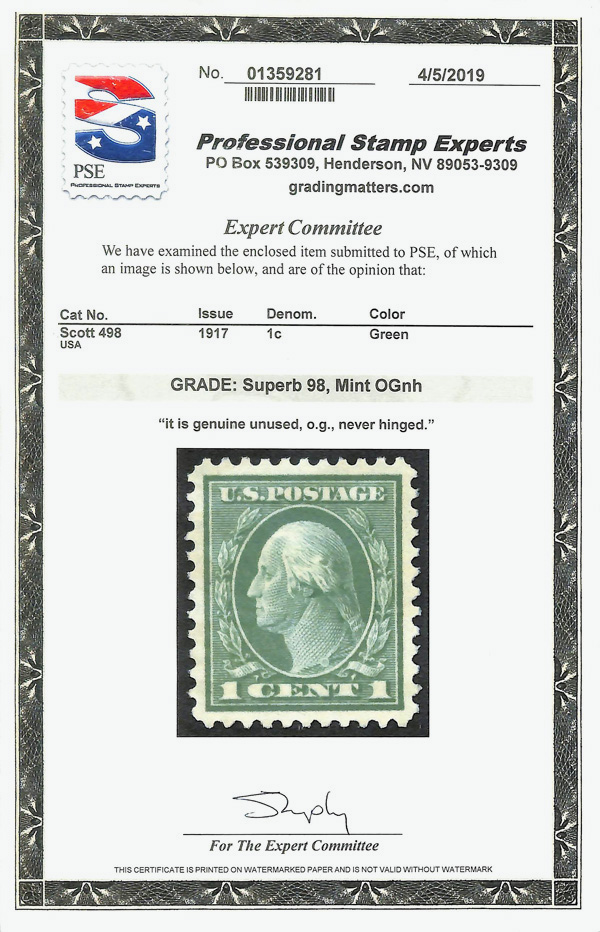 8242 nh 498 image1917, 1¢ green, perf. 11 (Scott 498), glowing surface with exceptional centering, o.g., never hinged, Superb, with 2019 P.S.E. certificate graded SUP 98.
