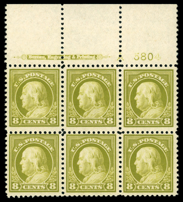 8259 nhbl 508 image1917, 8¢ olive bister, perf. 11 (Scott 508), plate block of 6 with 'A', o.g., never hinged, Very Fine.