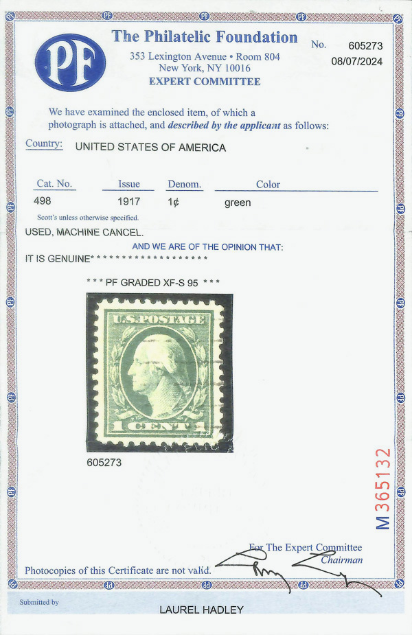 8245 O 498 image1917, 1¢ green, perf. 11 (Scott 498), very light cancel, Extremely Fine to Superb, with 2024 P.F. certificate graded XF-SUP 95.