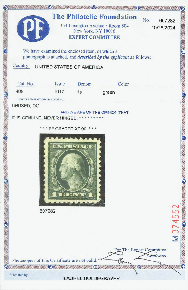 8243 nh 498 image1917, 1¢ green, perf. 11 (Scott 498), o.g., never hinged, Extremely Fine, with 2024 P.F. certificate graded XF 90.
