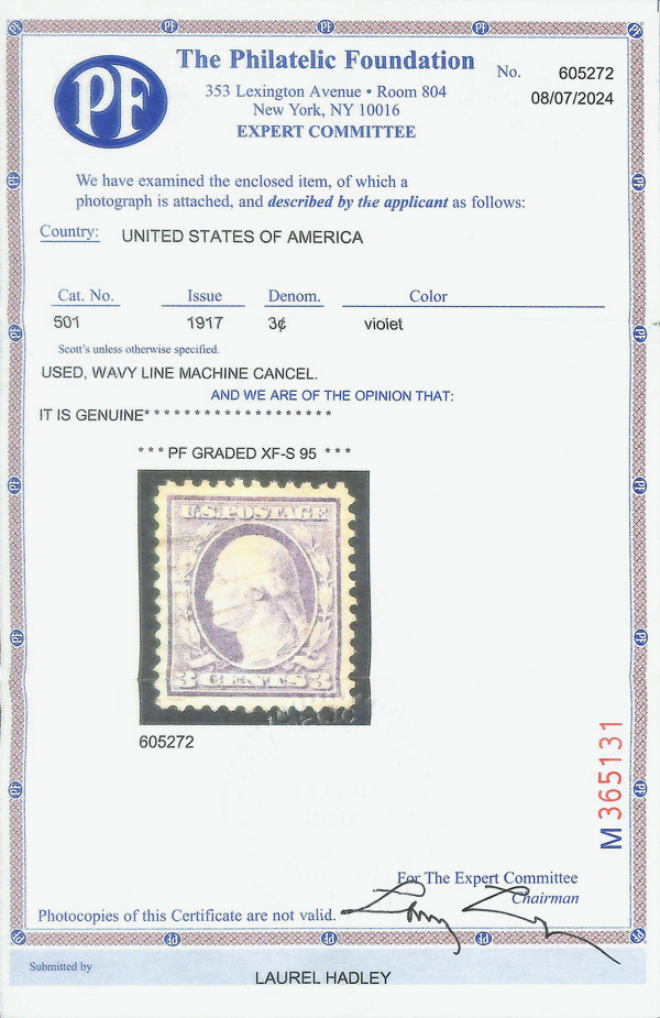 8250 O 501 image1917, 3¢ light violet, type I, perf. 11 (Scott 501), Extremely Fine to Superb, with 2024 P.F. certificate graded XF-SUP 95.