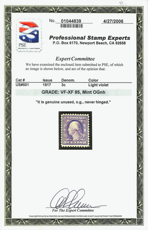 8249 nh 501 image1917, 3¢ light violet, type I, perf. 11 (Scott 501), o.g., never hinged, Very Fine to Extremely Fine, with 2006 P.S.E. certificate graded VF-XF 85.
