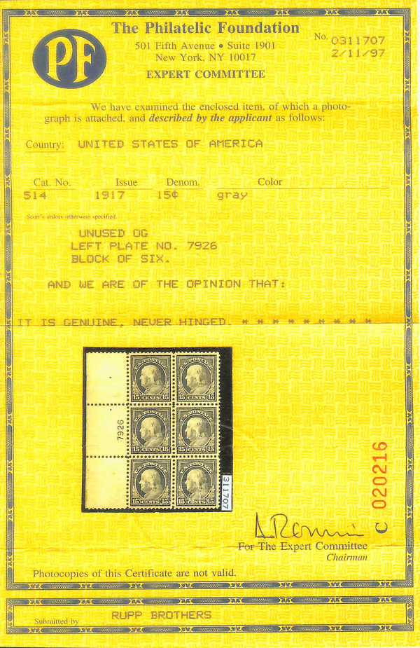 8267 nh 514 image1917, 15¢ gray, perf. 11 (Scott 514), o.g., never hinged, Extremely Fine, with photocopy of 1997 P.F. certificate for block.