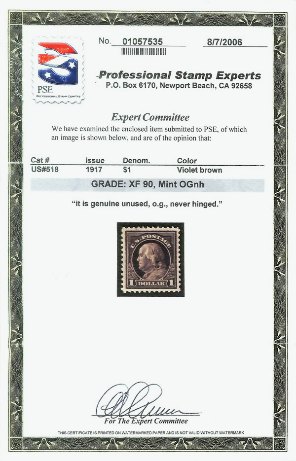 8271 nh 518 image1917, $1 violet brown, perf. 11 (Scott 518), o.g., never hinged, Extremely Fine, with 2006 P.S.E. certificate graded XF 90.