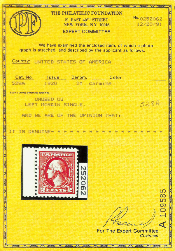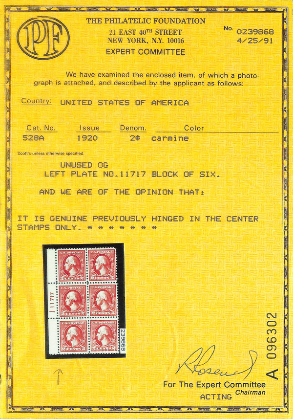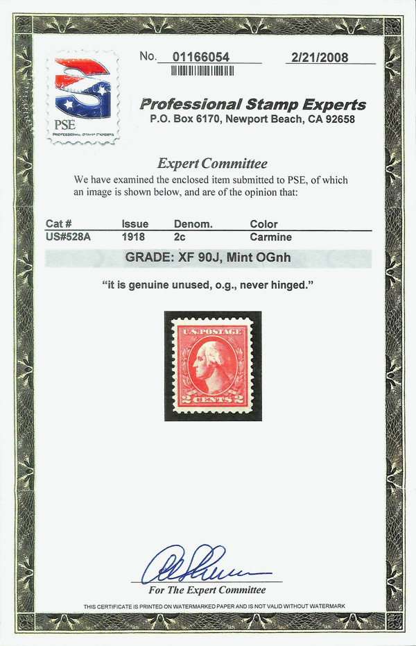 8280 nh 528A image1918, 2¢ carmine, type VI, offset printing (Scott 528A), o.g., never hinged, Extremely Fine, with 2008 P.S.E. certificate graded XF 90J; 1991 P.F. certificate & 1991 P.F. certificate for a plate block.