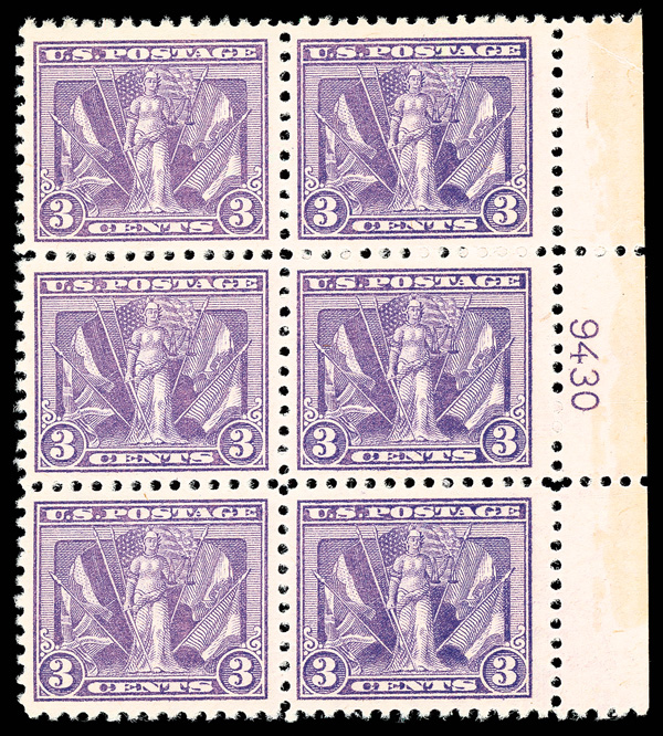8294 nhbl 537 image1919, 3¢ Victory (Scott 537), right margin plate number 9430 block of 6, o.g., never hinged, fresh with deep, bold color; selvage gum soaked, still Very Fine.
