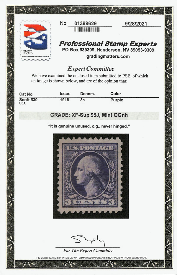 8285 nh 530 image1918, 3¢ purple, type IV, offset printing (Scott 530), glowing finish, beautiful borders, o.g., never hinged, Extremely Fine to Superb, with 2021 P.S.E. certificate graded XF-SUP 95J.