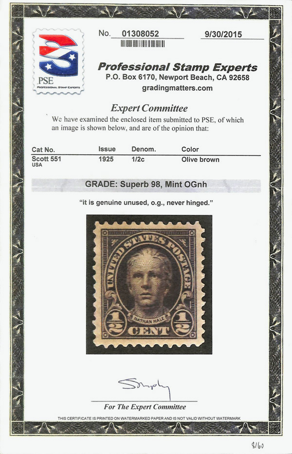 8310 nh 551 image1925, ½¢ Nathan Hale (Scott 551), ample margins, vivid layout, o.g., never hinged, Superb, with 2015 P.S.E. certificate graded SUP 98.