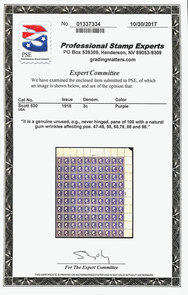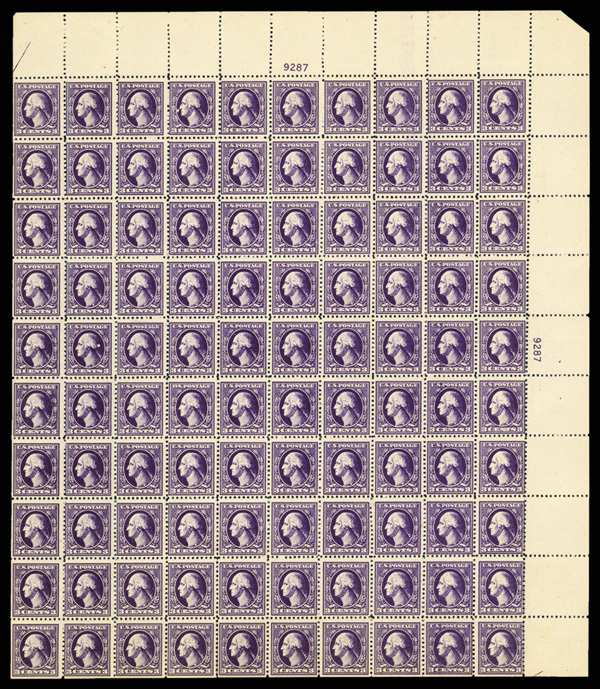 8286 nhbl 530 image1918, 3¢ purple, type IV, offset printing (Scott 530), full wide top right full pane of 100 with plate number 9287, o.g., never hinged, fresh with intense color and clean detail, both top and right selvage large enough to fit another stamp; natural gum wrinkle affecting eight stamps, Fine, with 2017 P.S.E. certificate.