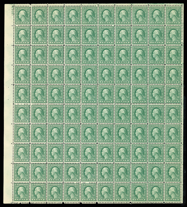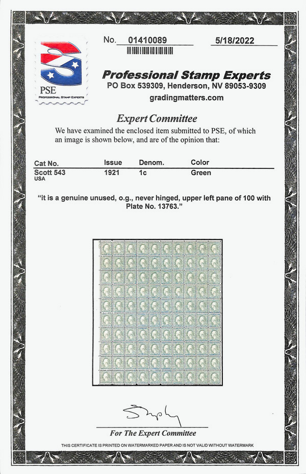 8300 nhbl 543 image1921, 1¢ green, rotary press coil waste, perf. 10 x 11 (Scott 543), top left full pane of 100 with plate number 13763, o.g., never hinged, fresh and sound, generally Fine to Very Fine with better, with 2022 P.S.E. certificate.