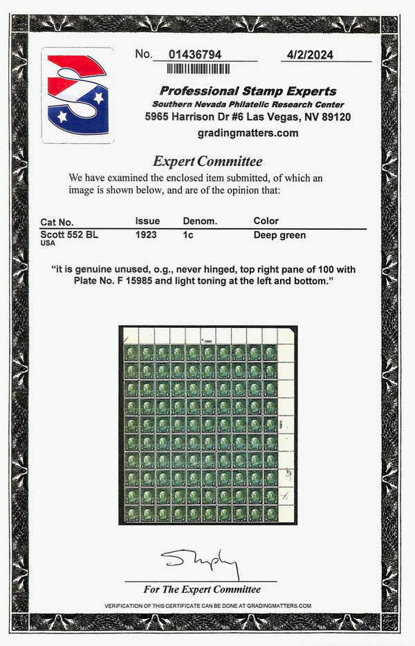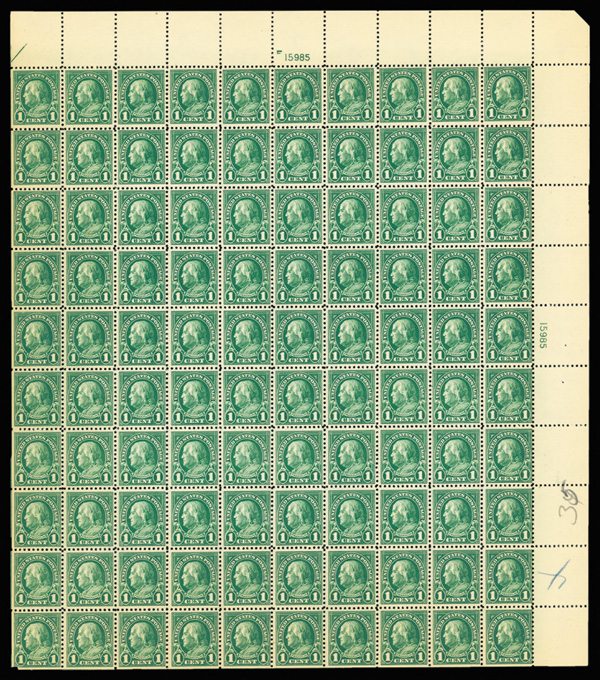 8312 nhbl 552 image1923, 1¢ Franklin (Scott 552), top right full pane of 100 with plate number F15985, o.g., never hinged, attractive with clean impressions; light toning at left and bottom, otherwise Fine to Very Fine, with 2024 P.S.E. certificate.