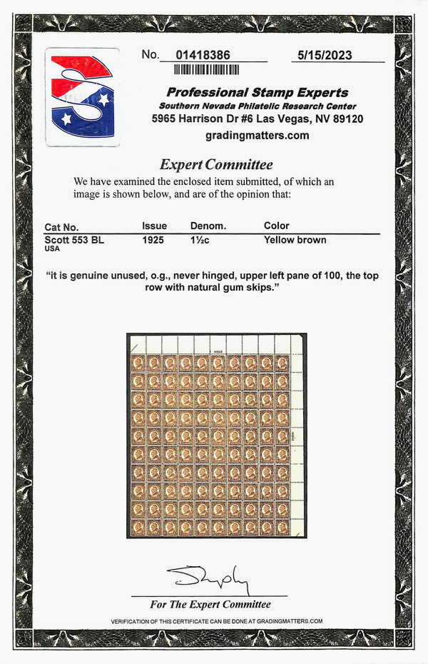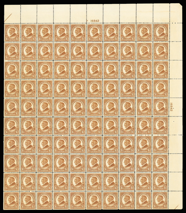 8315 nhbl 553 image1925, 1½¢ Harding (Scott 553), top right full pane of 100 with plate number F16842, o.g., never hinged, pristine with rich colors and attractive centering; top row with natural gum skips, Fine to Very Fine with better, with 2023 P.S.E. certificate erroneously as upper left pane.