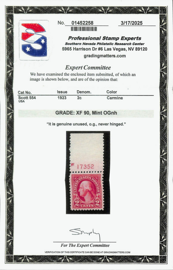8317 nh 554 image1923, 2¢ Washington (Scott 554), o.g., never hinged, Extremely Fine to Superb, with 2024 P.F. certificate graded XF-SUP 95.