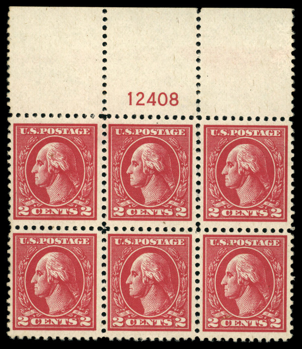 8283 nhbl 528B image1918, 2¢ carmine, type VII, offset printing (Scott 528B), plate block of 6, o.g., never hinged, Very Fine.
