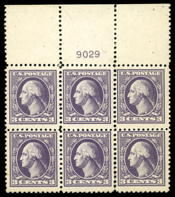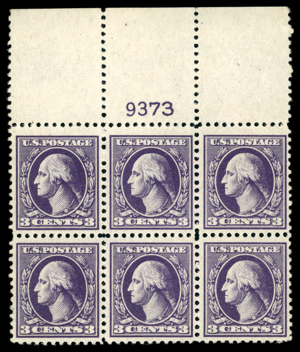 8284 nhbl 529 image1918, 3¢ violet, type III, offset printing (Scott 529), plate block of 6, o.g., never hinged (gum creases), Very Fine.