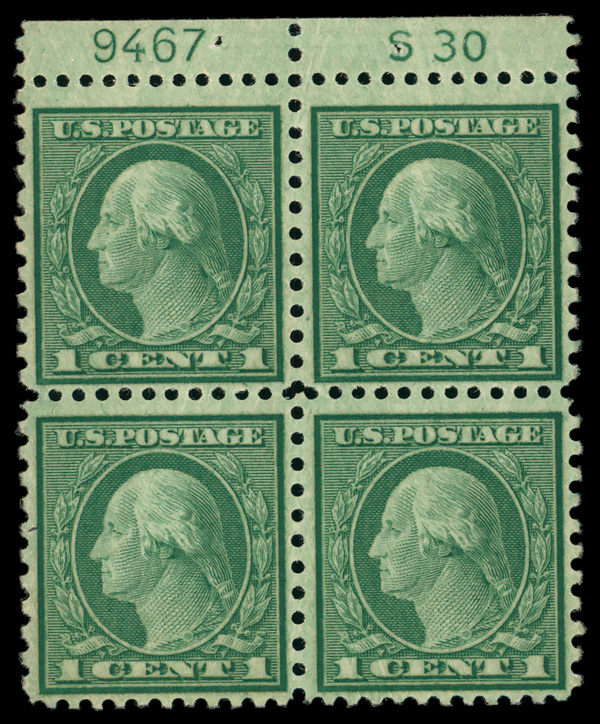 8291 ogbl 531 image1919, 1¢ green, offset printing, imperf. (Scott 531), plate block of 6, o.g., lightly hinged, Extremely Fine to Superb.