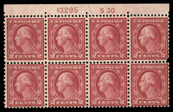 8298 nhbl 540 image1919, 2¢ carmine rose, type II, rotary press coil waste, perf. 11 x 10 (Scott 540), plate block of 8 with 'S30', o.g., never hinged; pulled perf at right, Fine to Very Fine.