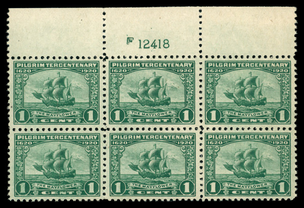 8307 nhbl 548 image1920, 1¢ Pilgrim (Scott 548), plate block of 6, o.g., never hinged (minor gum skips), Very Fine to Extremely Fine.