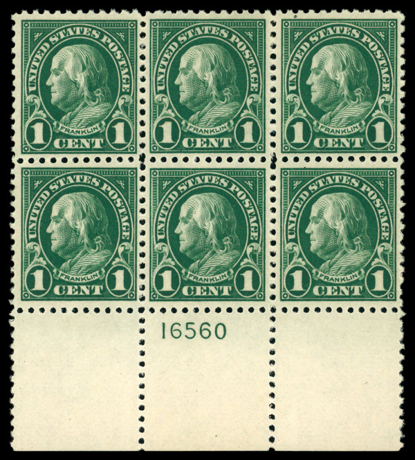 8311 nhbl 552 image1923, 1¢ Franklin (Scott 552), plate block of 6, o.g., never hinged, Extremely Fine.