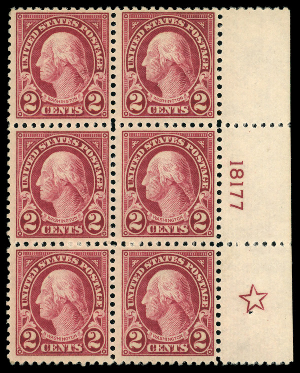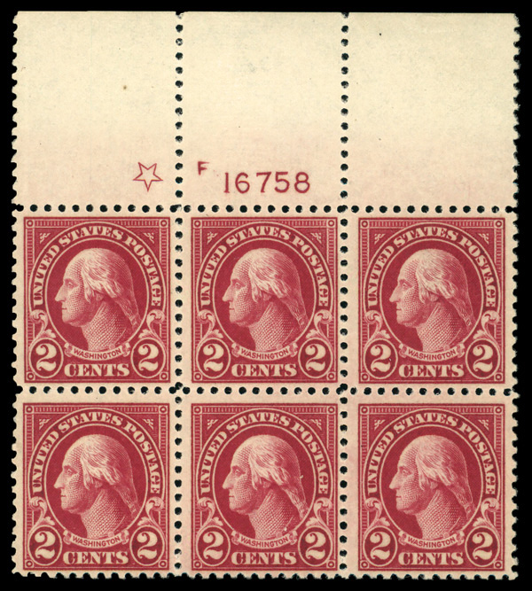 8319 nhbl 554 image1923, 2¢ Washington (Scott 554), plate block of 6 with large 5-point star, o.g., never hinged, Fine to Very Fine.