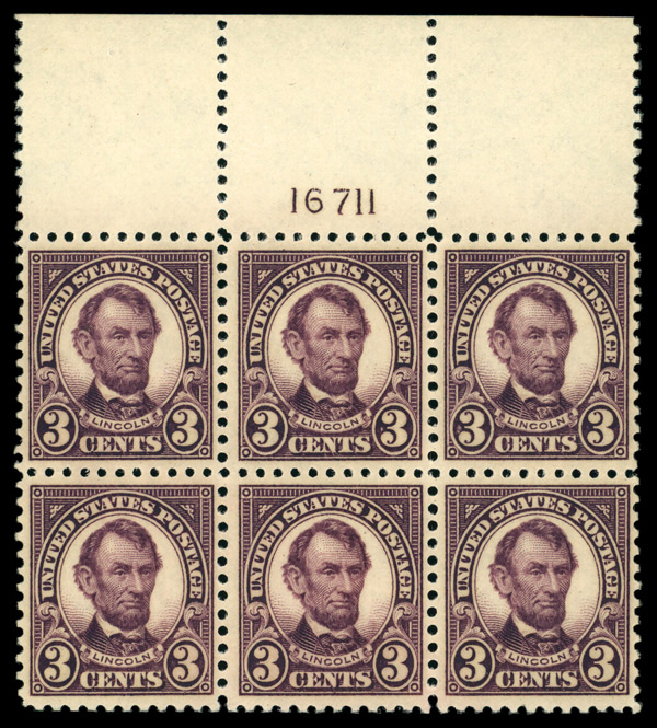 8320 nhbl 555 image1923, 3¢ Lincoln (Scott 555), plate block of 6, o.g., never hinged (gum skips), Very Fine.