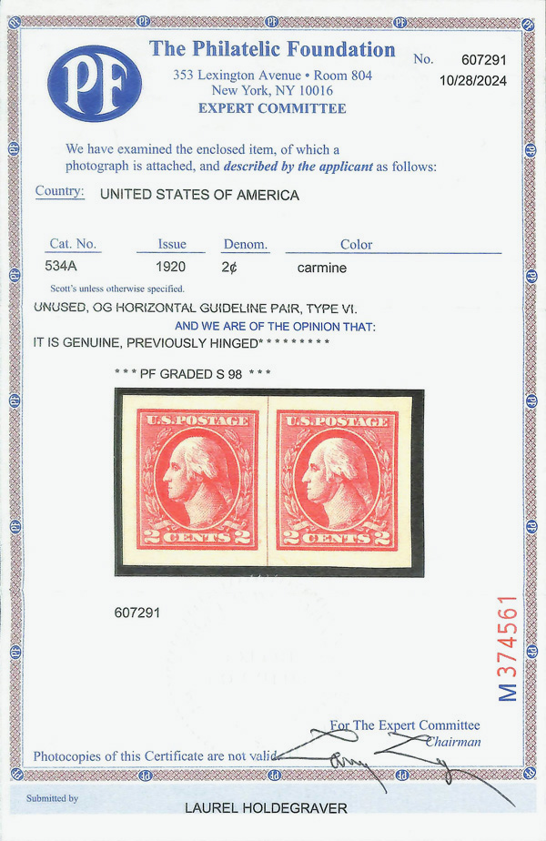 8293 og 534A image1918, 2¢ carmine, type VI, offset printing, imperf. (Scott 534A), vertical pair with guide line between, o.g., lightly hinged, Superb no SMQ price for S 98, with 2024 P.F. certificate graded SUP 98.