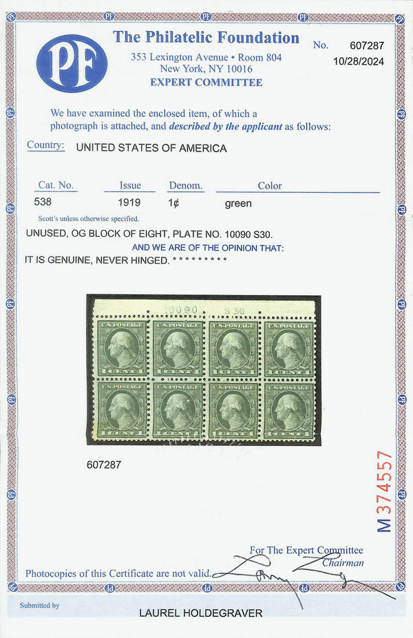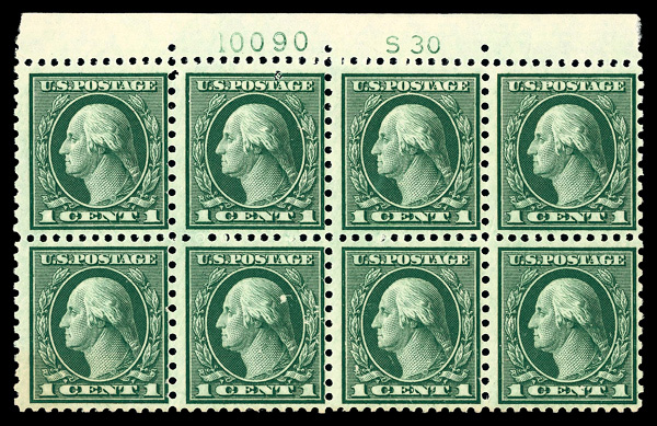 8296 nhbl 538 image1919, 1¢ green, rotary press coil waste, perf. 11 x 10 (Scott 538), plate block of 8 with 'S 30", o.g., never hinged, Fine, with 2024 P.F. certificate.