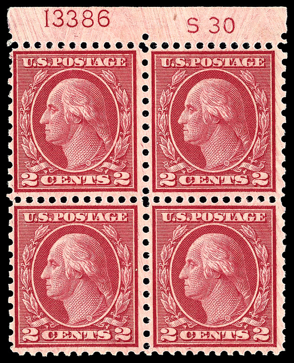 8297 nhbl 540 image1919, 2¢ carmine rose, type II, rotary press coil waste, perf. 11 x 10 (Scott 540), plate block of 4 with 'S30', o.g., never hinged, Very Fine.
