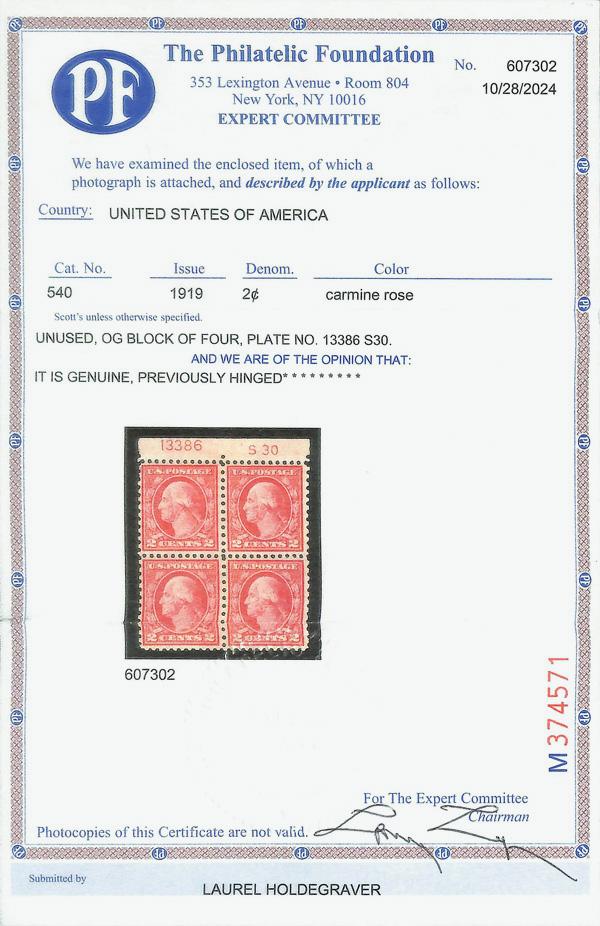 8299 ogbl 540 image1919, 2¢ carmine rose, type II, rotary press coil waste, perf. 11 x 10 (Scott 540), plate block of 4 with 'S 30', o.g., lightly hinged, Fine to Very Fine, with 2024 P.F. certificate.