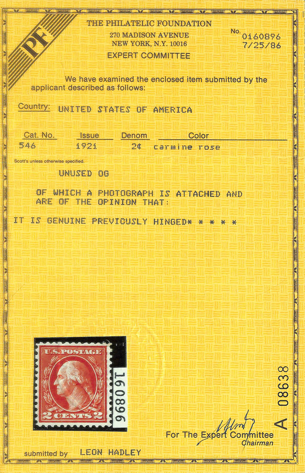 8301 og 546 image1921, 2¢ carmine rose, type III, rotary press coil waste, perf. 11 (Scott 546), o.g., hinged, Fine to Very Fine, with 1986 P.F. certificate.