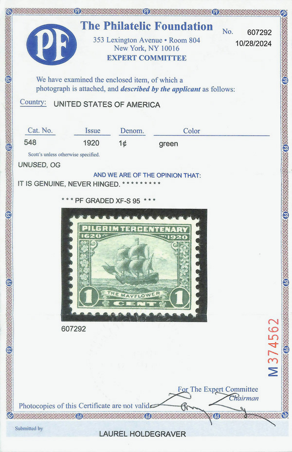 8306 nh 548 image1920, 1¢ Pilgrim (Scott 548), o.g., never hinged, Extremely Fine to Superb, with 2024 P.F. certificate graded XF-SUP 95.