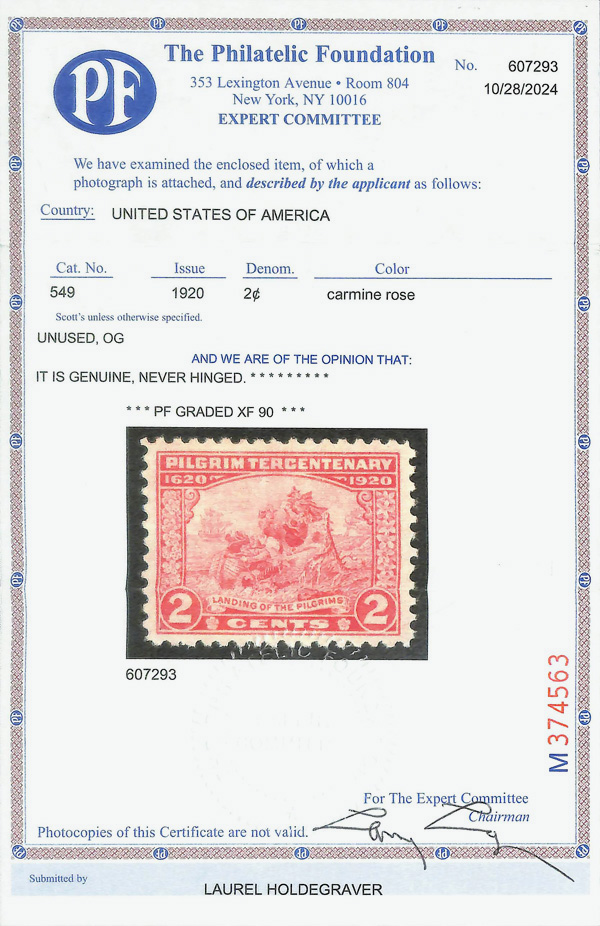 8308 nh 549 image1920, 2¢ Pilgrim (Scott 549), o.g., never hinged, Extremely Fine, with 2024 P.F. certificate graded XF 90.