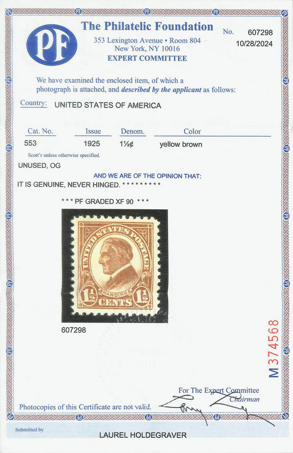 8313 nh 553 image1925, 1½¢ Harding (Scott 553), o.g., never hinged, Extremely Fine, with 2024 P.F. certificate graded XF 90.