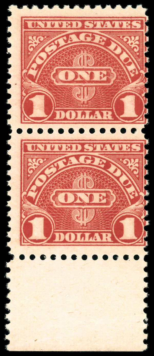 7463 nh J77a imagePostage Due, 1930, $1 scarlet (Scott J77a), bottom margin vertical pair, o.g., never hinged, Very Good to Fine.