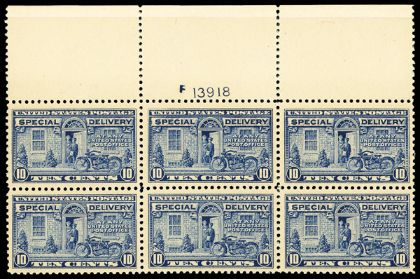 7447 nhbl E13 imageSpecial Delivery, 1925, 15¢ deep orange (Scott E13), top margin plate block of 6, Lovely glowing tone, o.g., never hinged, Very Fine.