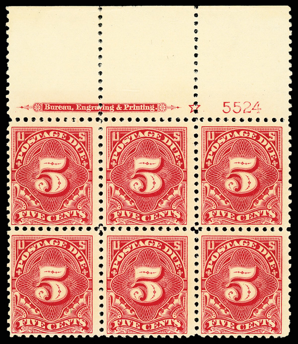 7457 nhbl J64 imagePostage Due, 1917, 5¢ carmine, unwatermarked, perf. 11 (Scott J64), top margin plate block of 6 with star, Exceptionally rich color, o.g., never hinged, Fine to Very Fine.