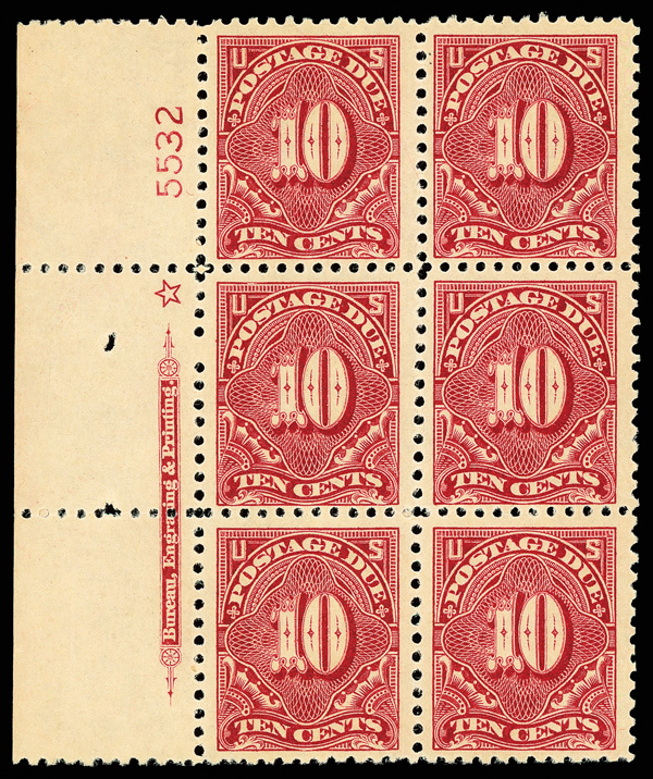 7458 nhbl J65 imagePostage Due, 1917, 10¢ carmine rose, unwatermarked, perf. 11 (Scott J65), left margin plate block of 6 with star, Stunning vibrant hue, o.g., never hinged, Fine to Very Fine.