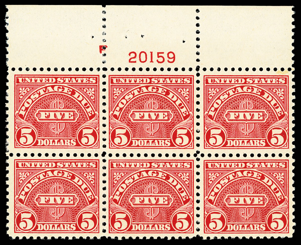 7464 nhbl J78 imagePostage Due, 1930, $5 dull carmine, wet printing (Scott J78), top margin plate block of 6, Beautifully vivid shade, o.g., never hinged, Fine to Very Fine.